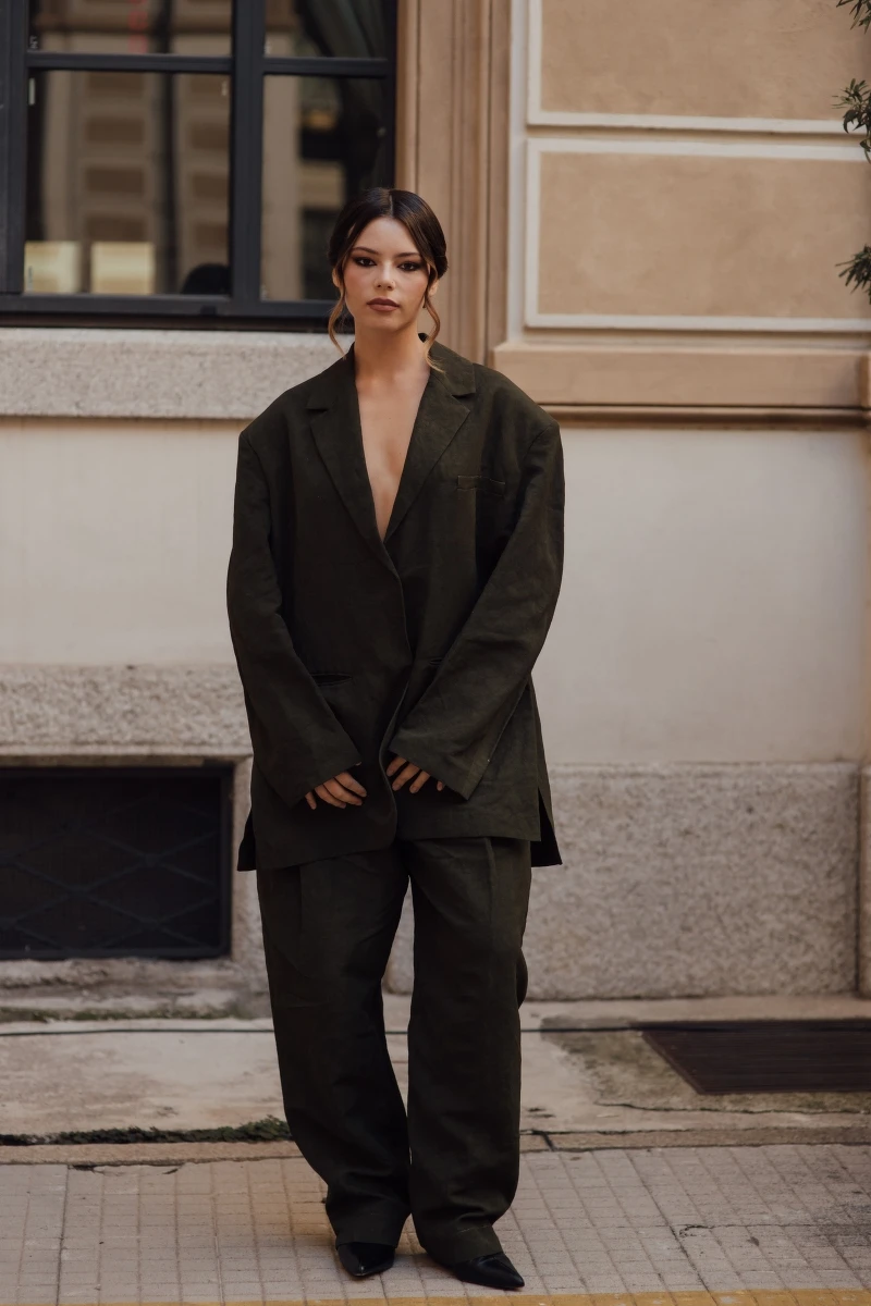 一整套的同色系,打造的气场,Oversize 外套和弧形裤管碰撞,既有时髦的中性氛围,又保持立体轮廓。