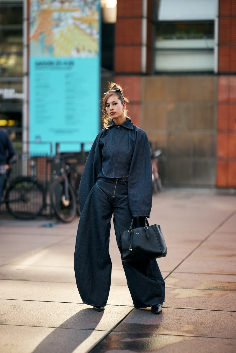丹宁套装搭配弧形剪裁的弯刀裤,营造出立体而具份量感的轮廓,整体线条俐落又有时髦态度,黑色手袋与尖头鞋更是为整体增添干练气势。