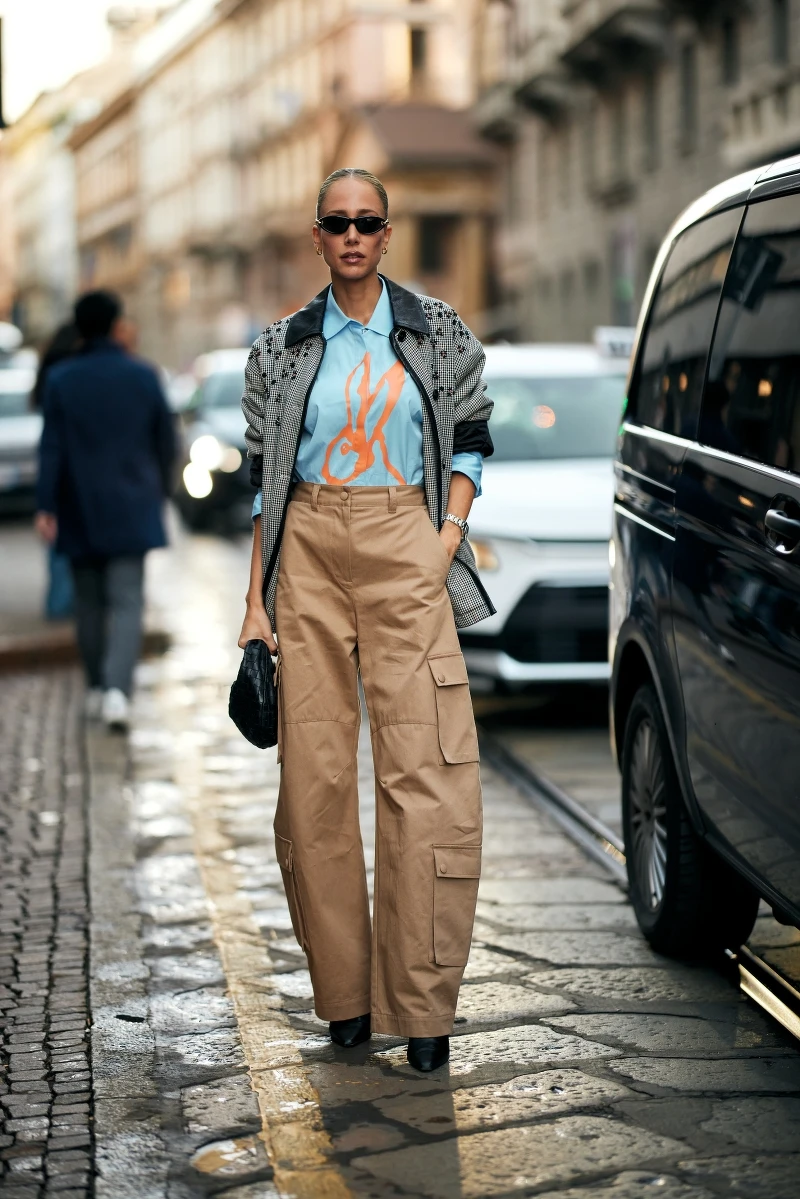 淡蓝色印花衬衫搭配卡其色工装弯刀裤,撞出俐落又具玩味的时尚感,外搭格纹拼皮革外套增添结构层次,整体呈现都会女性的帅气率性风格。
