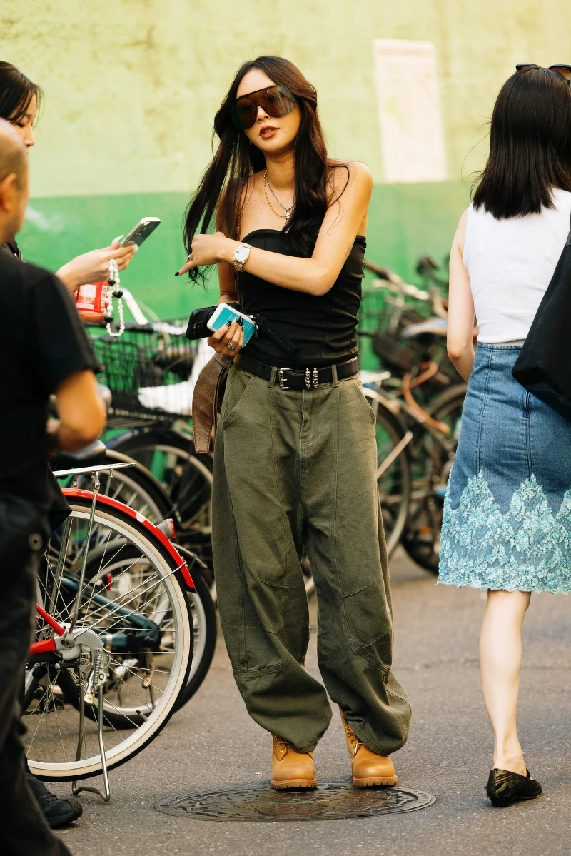 以黑色平口上衣搭配军绿色弯刀裤,展现率性又性感的对比魅力,下身裤型宽鬆、线条自然弧形,搭配麂皮工装靴增添街头氛围。