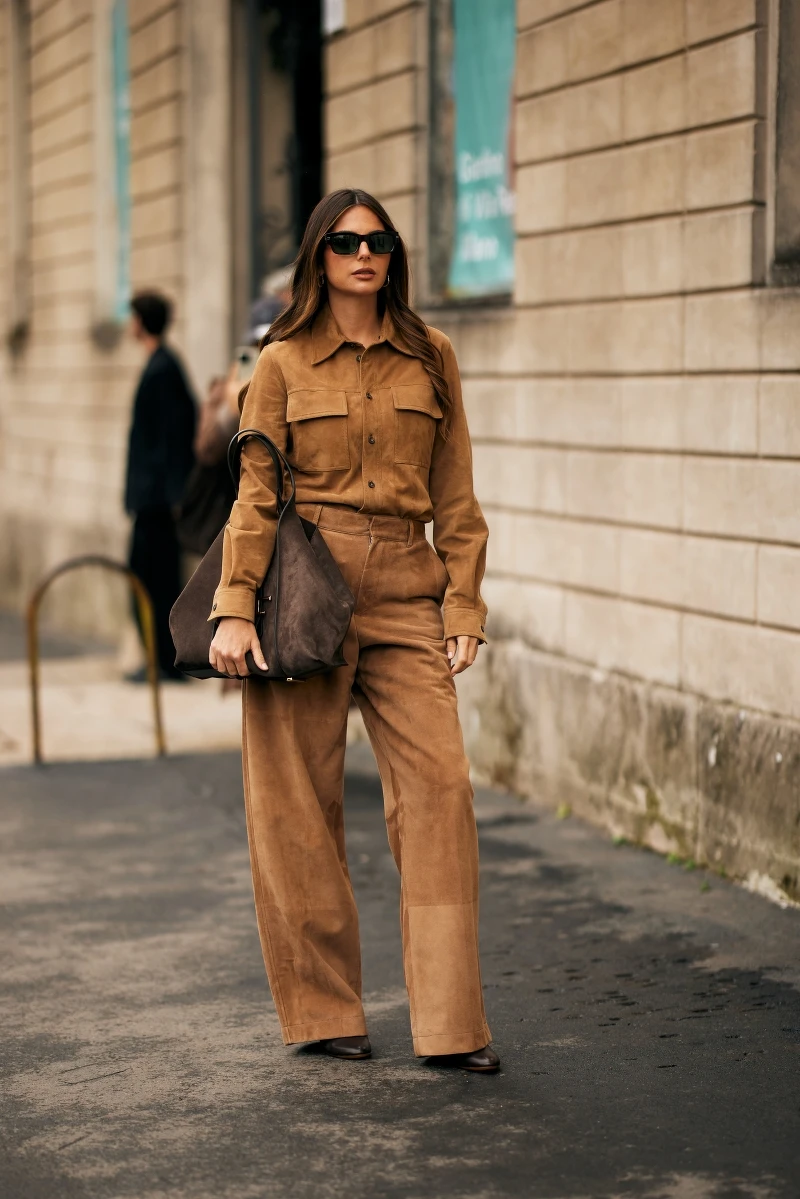 弯刀裤套装超有秋冬氛围!上身衬衫搭配同材质弯刀裤,柔软质地让轮廓更立体又不呆板,整体色调统一又有层次感,不用费心就能很时髦的组合。